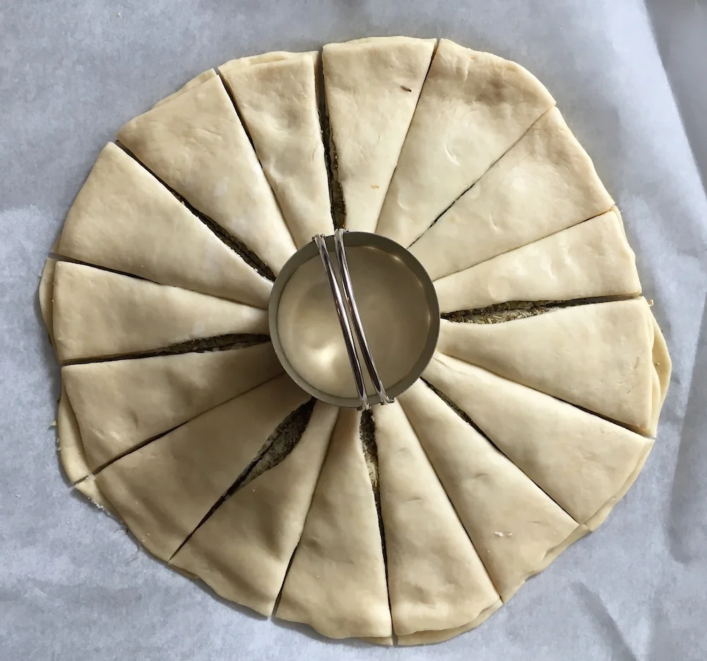 Using a very sharp knife, cut through the dough from the outer edge to the edge of the circular object in the center. Cut sixteen equal slices.