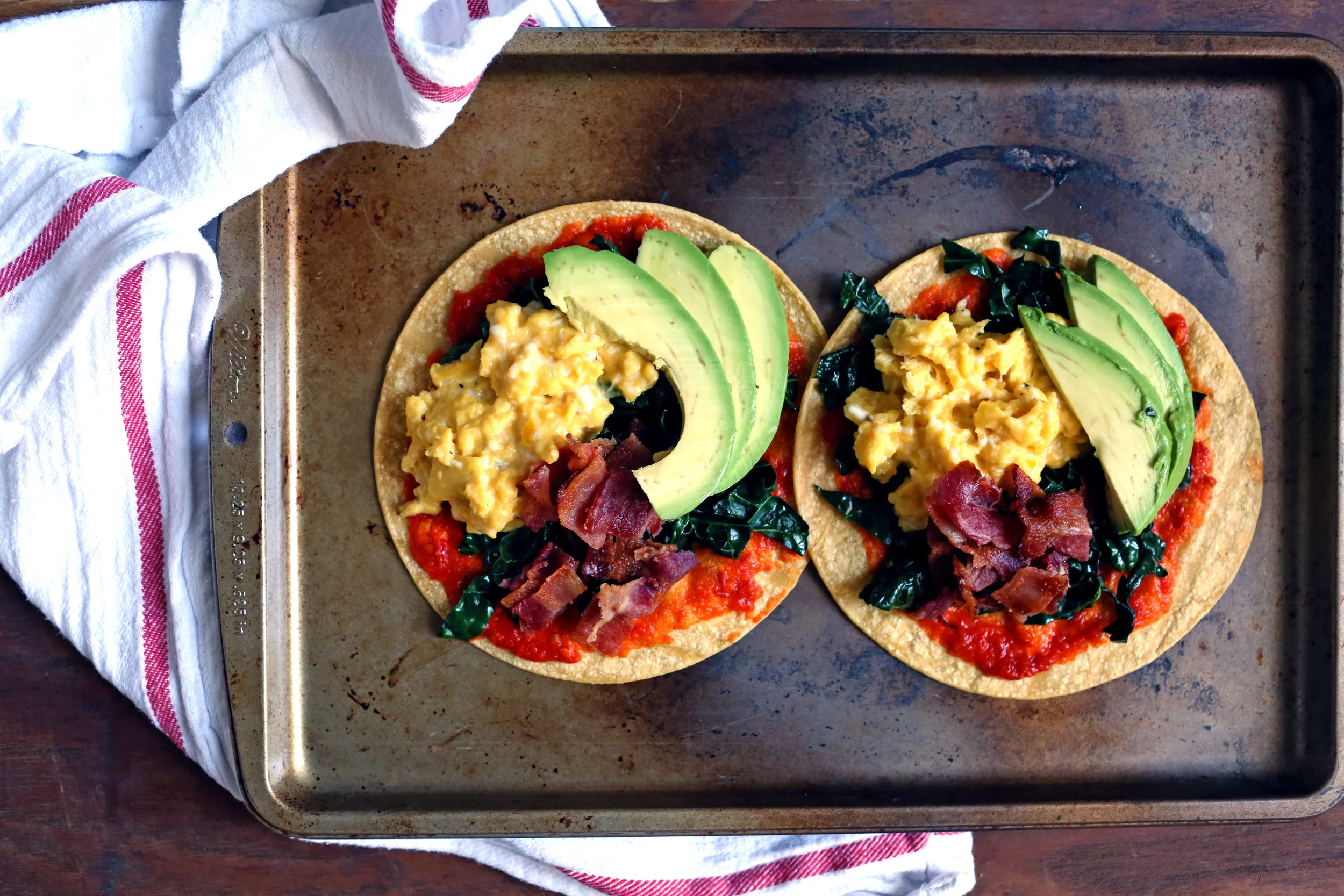 Place two warm tortillas on each plate. Spread a thin layer of harissa over each tortilla. Top with scrambled egg, sautéed kale, and some chopped bacon. Add a few slices of avocado.
